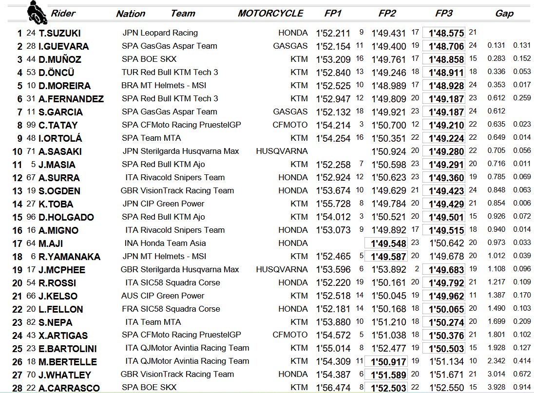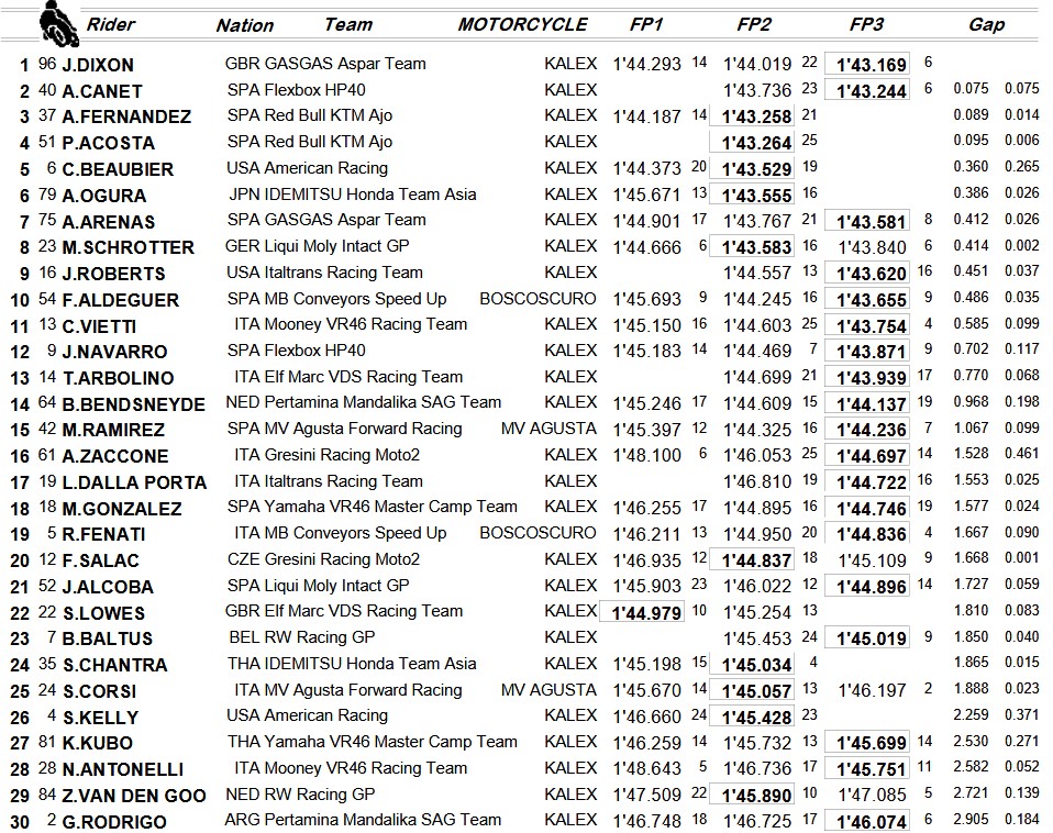 https://www.forum-gpmoto.com/wp-cont...oto2-jerez.jpg Dixon meilleur chrono en Moto2 dans l'équipe Aspar dorénavant devant Canet (Pons), A Fernandez (Ajo) et Acosta (Ajo). Les chronos ne sont pas les meilleurs du circuit, mais tout de même assez rapide. Sans surprise, Acosta est déjà dans le coup (enfin, toujours dans le coup car c'est le cas depuis les essais). Les rookies hors Acosta sont loin, que ce soit Antonelli, Rodrigo, Kelly, Kubo, VD Goorbergh, Alcoba, Salac... https://www.forum-gpmoto.com/wp-cont...-20-120544.jpg En Moto3, Suzuki sur sa Leopard le plus rapide, logique j'ai envie de dire vu le niveau des Leopard depuis 2 ans à Portimao. Je sens bien Guevara cette année, alors que Munoz, rookie est déjà 3ème... Oncu bien placé Par contre, Fellon toujours loin... Et je ne parle pas de Carrasco qui est à 4 secondes... :boutons: |