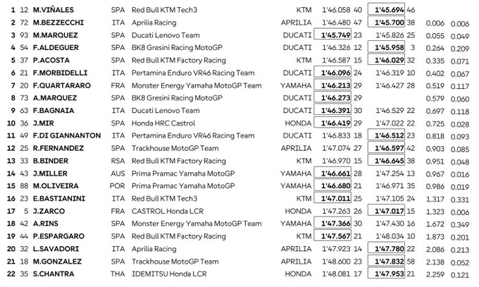 Jour 1 Pos No Rider Bike Time Diff Prev 1 41 Aleix Espargaro Honda RC213V 1:39.073 2 88 Miguel Oliveira Yamaha M1 1:39.168 0.095 0.095 3 44 Pol Espargaro KTM RC16 1:39.235 0.162 0.067 4 43 Jack Miller Yamaha M1 1:39.532 0.459 0.297 5 26 Dani Pedrosa KTM RC16 1:40.524 1.451 0.992 6 51 Michele Pirro Ducati GP25 1:40.781 1.708 0.257 7 96 Andrea Dovizioso/ Augusto Fernandez Yamaha 1:41.080 2.007 0.299 8 96 Andrea Dovizioso/ Augusto Fernandez Yamaha 1:41.454 2.381 0.374 Jour 2 Pos No Rider Bike Time Diff Prev 1 41 Aleix Espargaro Honda RC213V 1:39.073 2 88 Miguel Oliveira Yamaha M1 1:39.168 0.095 0.095 3 44 Pol Espargaro KTM RC16 1:39.235 0.162 0.067 4 43 Jack Miller Yamaha M1 1:39.532 0.459 0.297 5 26 Dani Pedrosa KTM RC16 1:40.524 1.451 0.992 6 51 Michele Pirro Ducati GP25 1:40.781 1.708 0.257 7 96 Andrea Dovizioso/ Augusto Fernandez Yamaha 1:41.080 2.007 0.299 8 96 Andrea Dovizioso/ Augusto Fernandez Yamaha 1:41.454 2.381 0.374 Difficile de savoir ce qui était derrière le carénage des Yam mais si la 96 est le V4 c'est encourageant pour une première sortie |