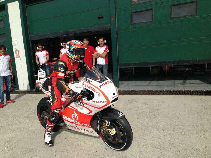 https://pbs.twimg.com/media/BORGpsuCUAAAs2D.jpg:large Premiers tours de roues pour Alex De Angelis sur la Ducati Pramac. Je crois que c'était à Misano, mais à confirmer. |