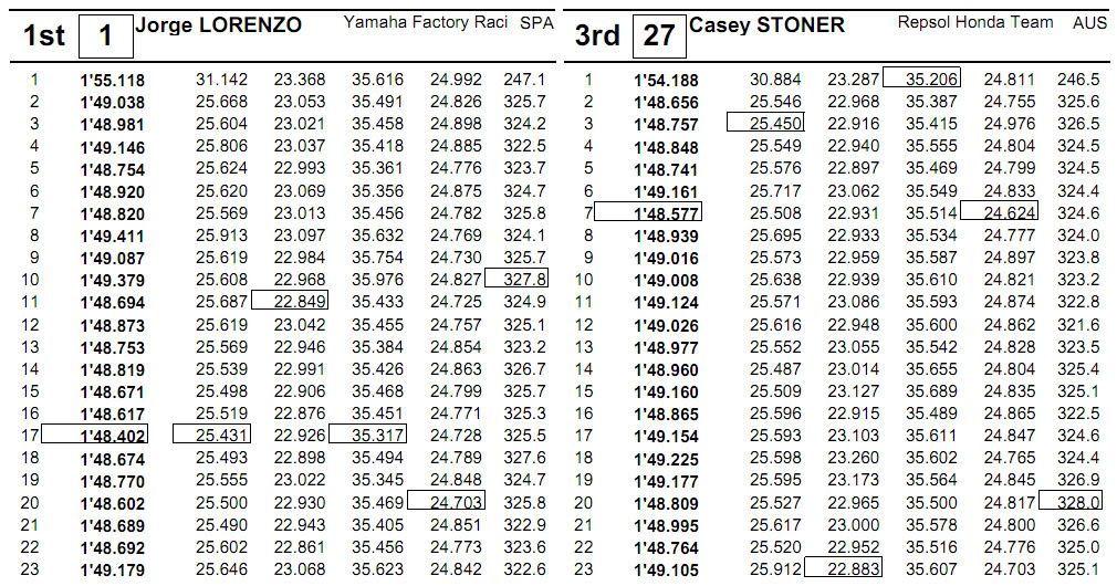 1 1'57.609 2 1'52.484 3 1'51.539 4 1'51.271 5 1'52.022 6 1'51.398 7 1'53.384 8 1'52.556 9 1'53.000 10 1'52.607 11 1'52.798 12 1'52.389 13 1'52.230 14 1'52.120 et ensuite en 1'52 bas Donc sur les tours en gras il est vraiment lent et ralentit d'un coup puis se stabilise en 1'52. Par rapport à Stoner qui était en 1'48-1'49 ça fait beaucoup:):) |