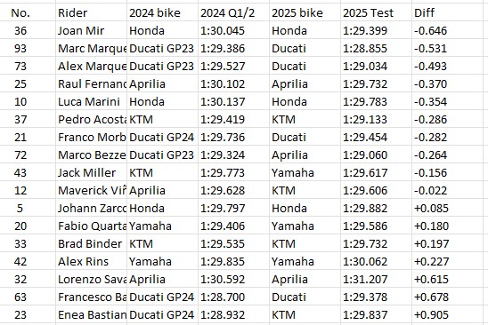 No. Rider 2024 bike 2024 Q1/2 2025 bike 2025 Test Diff