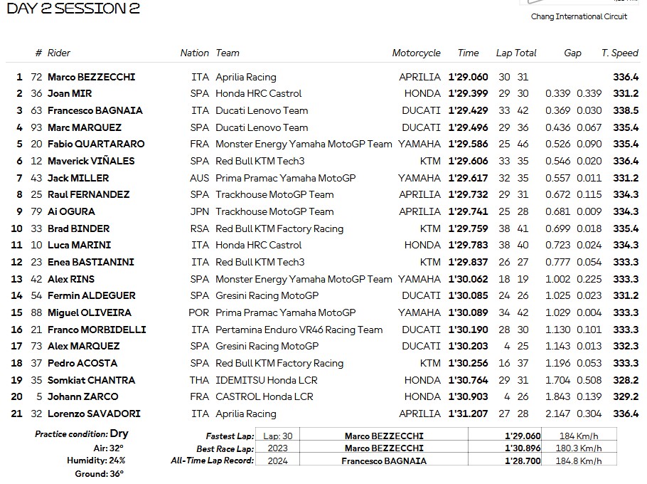 72 Marco Bezzecchi Ducati GP23 1:29.324 Aprilia 1:29.060 -0.264