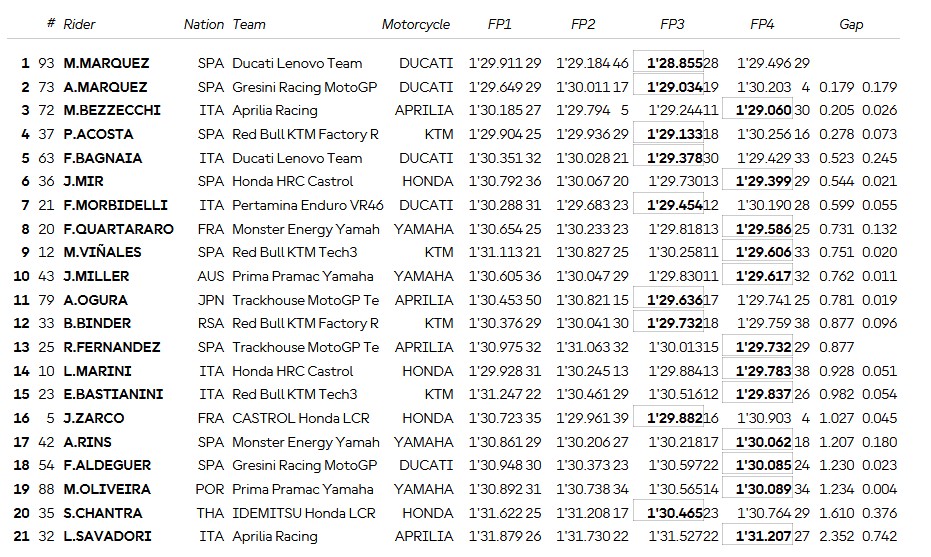 12 Maverick Viñales Aprilia 1:29.628 KTM 1:29.606 -0.022