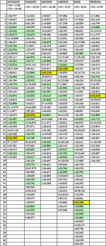 Marquez toujours aussi régulier, un paquet de tours en 55, ce qui signifie pour moi qu'il est déjà en mode course...