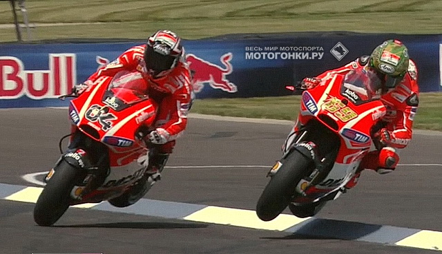 Pedrosa a une demi-moto d'avance et est à l'intérieur, mais Lorenzo joue son va-tout en soulageant les freins pour rester en tête. La manœuvre le fait cependant élargir, ce qui permet à Pedrosa de plonger en tête dans le dernier virage et de franchir la ligne d'arrivée en vainqueur !