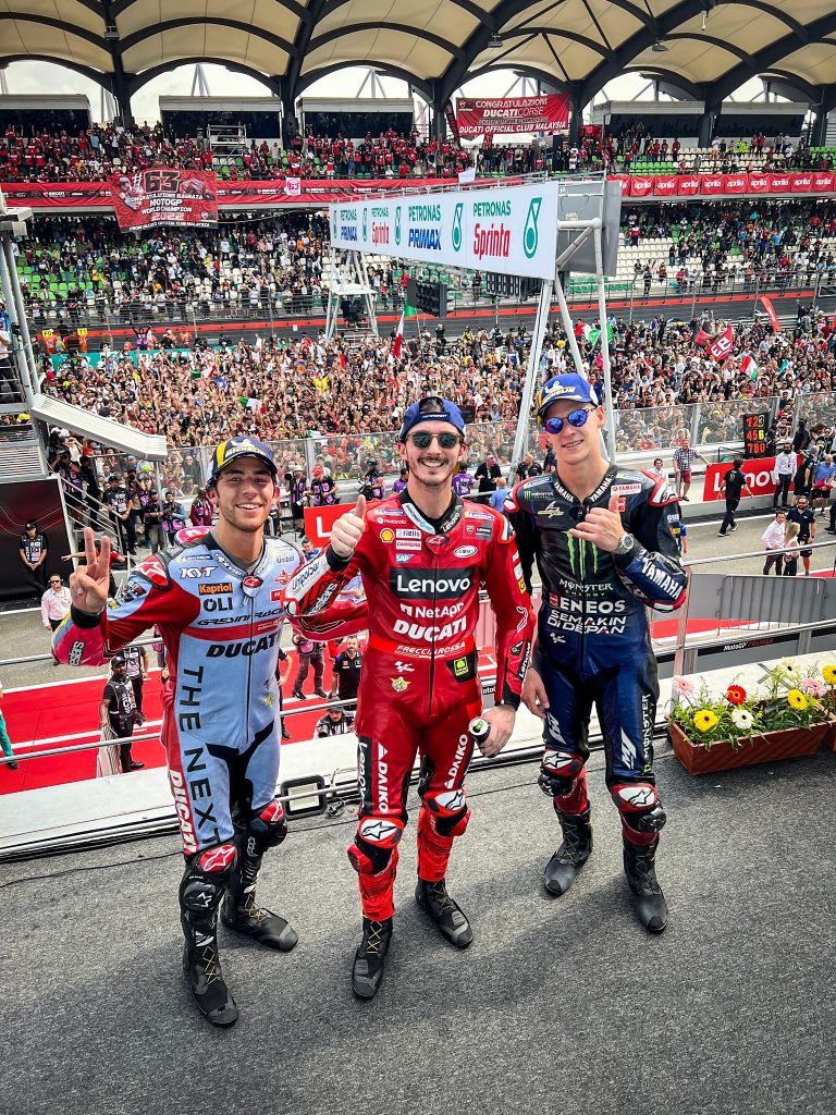 Ducati a donné des consignes d’équipe à leurs pilotes. Ne pas prendre de risque face à Bagnaia. On l’a vu quelques fois depuis plusieurs GP, et certaines fois on peut se poser la question de la réelle envie des coéquipiers de Bagnaia de le dépasser. Les pilotes sont tous sous contrat avec Ducati et ils ne vont pas prendre le risque de se faire mal voir.